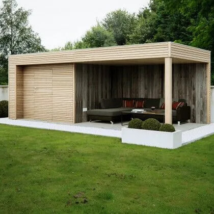 Son coin salon, habillé d’authentique Bois de Grange (Barnwood), crée une atmosphère chaleureuse et naturelle. Ce mélange subtil de modernité et de charme rustique en fait un espace idéal pour vos moments de détente en plein air.