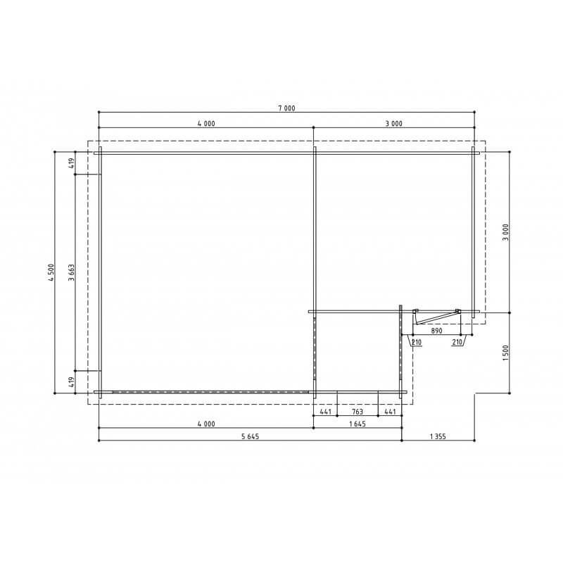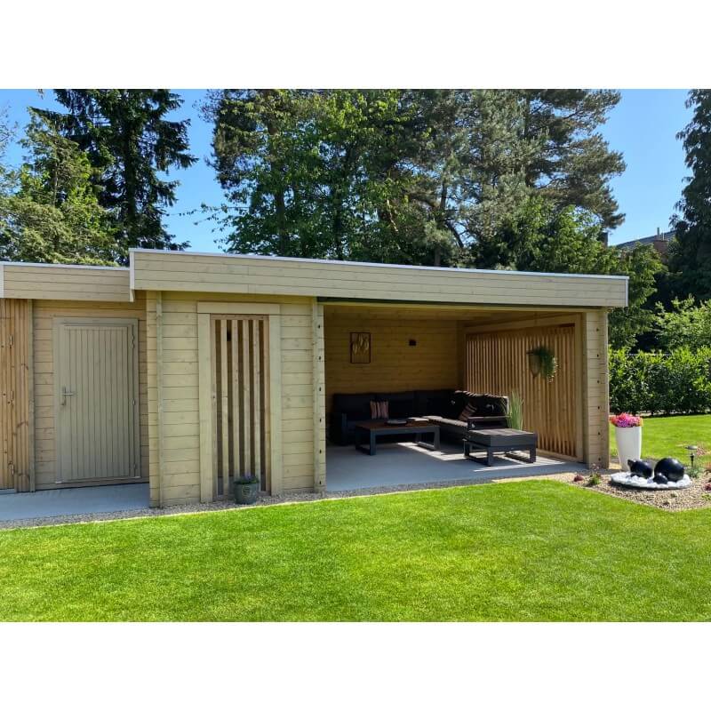- Surface extérieure : 31.50 m², construction en 3 parties : un lounge, un espace de rangement avec une porte pleine en bois massif, et un espace supplémentaire intermédiaire pour plus de polyvalence.